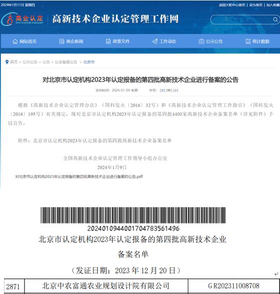 2024年1月9日,全國高新技術(shù)企業(yè)認(rèn)定管理工作領(lǐng)導(dǎo)小組辦公室對北京市認(rèn)定機(jī)構(gòu)2023年認(rèn)定報(bào)備的第四批高新技術(shù)企業(yè)進(jìn)行了備案公示,北京中農(nóng)富通農(nóng)業(yè)規(guī)劃設(shè)計(jì)院有......