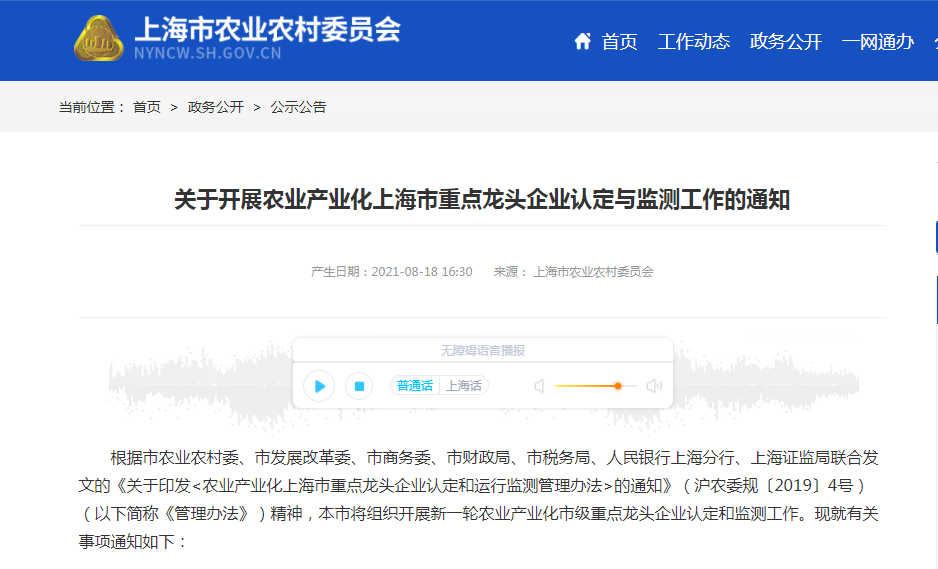 根據(jù)市農(nóng)業(yè)農(nóng)村委、市發(fā)展改革委、市商務(wù)委、市財政局、市稅務(wù)局、人民銀行上海分行、上海證監(jiān)局聯(lián)合發(fā)文的《關(guān)于印發(fā)<農(nóng)業(yè)產(chǎn)業(yè)化上海市重點龍頭企業(yè)認(rèn)定和運行監(jiān)測......
