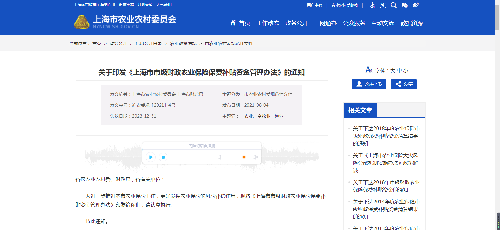 第一章 總則第一條 為加強(qiáng)農(nóng)業(yè)保險(xiǎn)保費(fèi)補(bǔ)貼資金管理,提高財(cái)政資金使用效益,根據(jù)《農(nóng)業(yè)保險(xiǎn)條例》《中央財(cái)政農(nóng)業(yè)保險(xiǎn)保費(fèi)補(bǔ)貼管理辦法》(財(cái)金〔2016〕123號(hào)......