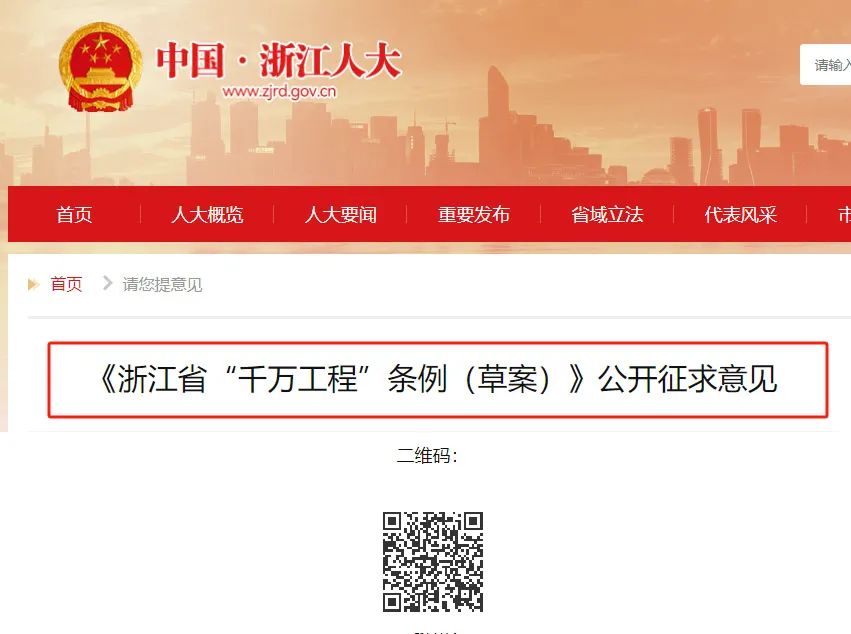 《浙江省“千萬工程”條例(草案)》已經省十四屆人大常委會第十一次會議審議。現將草案和說明予以公布。社會公眾可以掃描二維碼將意見反饋至省人大常委會法工委。意見征集......