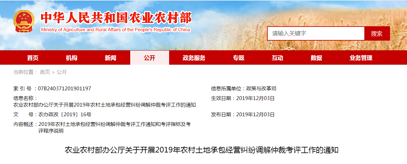 農(nóng)業(yè)農(nóng)村部辦公廳關(guān)于開展2019年農(nóng)村土地承包經(jīng)營糾紛調(diào)解仲裁考評(píng)工作的通知...