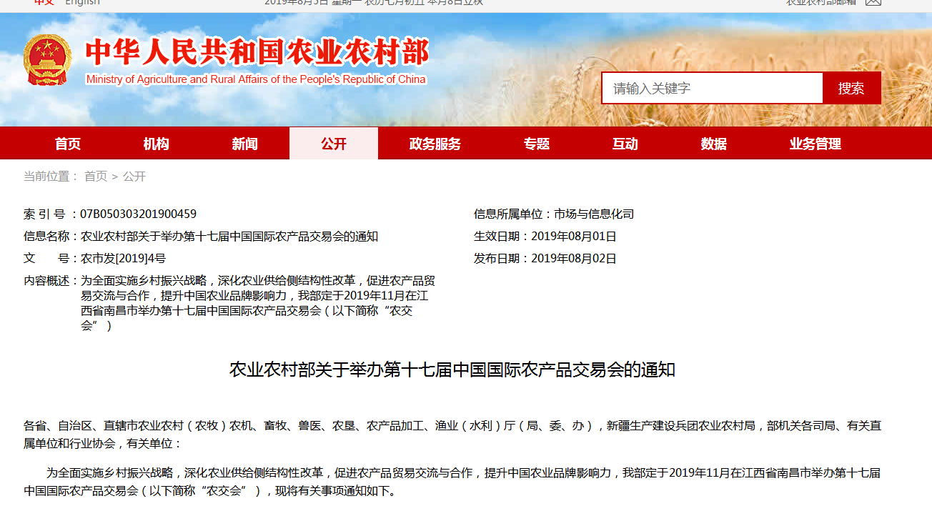為全面實施鄉(xiāng)村振興戰(zhàn)略,深化農(nóng)業(yè)供給側(cè)結構性改革,促進農(nóng)產(chǎn)品貿(mào)易交流與合作,提升中國農(nóng)業(yè)品牌影響力,我部定于2019年11月在江西省南昌市舉辦第十七屆中國國際農(nóng)......