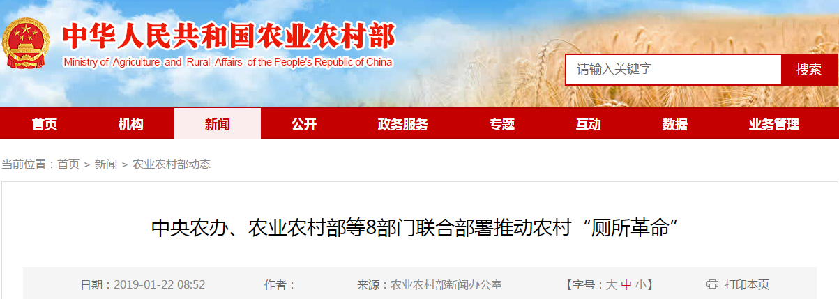 近日,中央農(nóng)辦、農(nóng)業(yè)農(nóng)村部、國家衛(wèi)生健康委、住房城鄉(xiāng)建設(shè)部、文化和旅游部、國家發(fā)展改革委、財(cái)政部、生態(tài)環(huán)境部等8部委聯(lián)合印發(fā)了《關(guān)于推進(jìn)農(nóng)村“廁所革命”專項(xiàng)行動(dòng)......