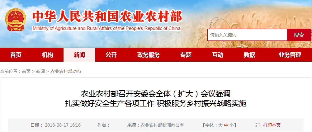 8月17日,農(nóng)業(yè)農(nóng)村部召開安委會第一次全體(擴大)會議,深入學習貫徹習近平總書記關于安全生產(chǎn)工作的重要論述,傳達學習李克強總理就全國安全生產(chǎn)電視電話會議的重要批......