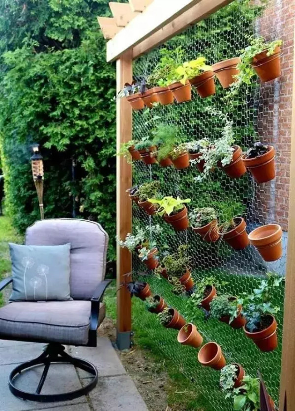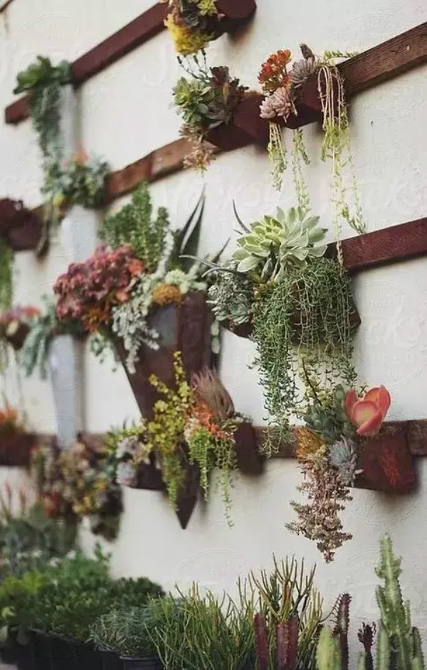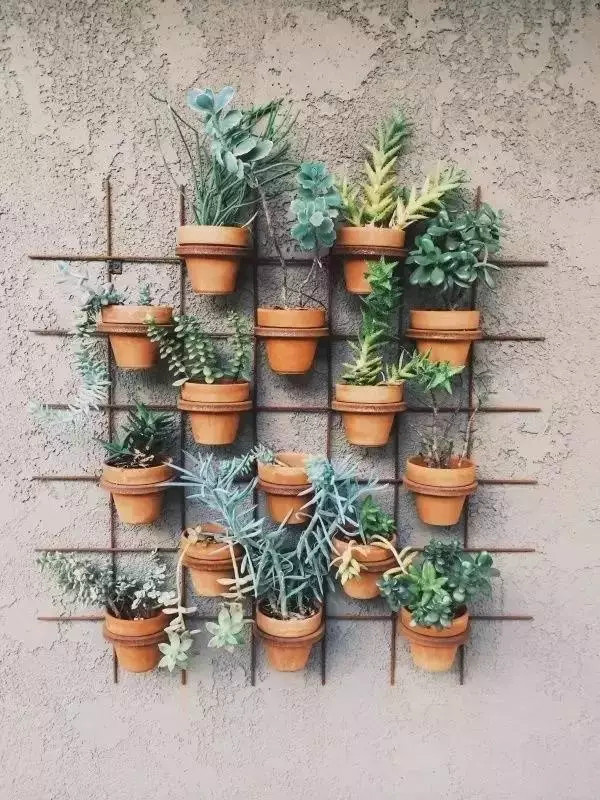 誰說盆栽只能放在桌子或者地面上的?除了這兩個地方,你還可以把它們掛在任何一面你能看見的墻上。比如你可以模仿綠籬上的藤蔓植物,把它們掛在柵欄上,同時掛花盆比種植綠籬更加方便和快捷。