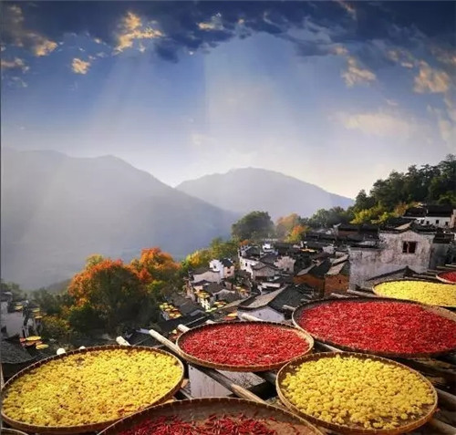 將村落上周的拋荒梯田集中流轉,用傳統(tǒng)方式打造“千畝梯田花海”,同時,種植大量皇菊、辣椒等農(nóng)作物,既成為曬秋盤里的原材料,又為景區(qū)食府提供了食材。如今,篁嶺曬秋已成為“最美中國符號”。