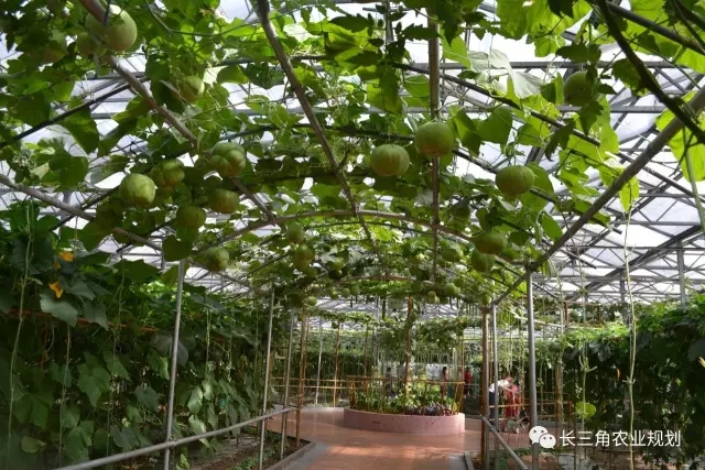 利用果實(shí)形態(tài)各異的觀賞瓜果類蔬菜構(gòu)建園區(qū),特別是利用各式各樣的棚架或長廊栽植藤本瓜果,讓其自然攀爬,形成瓜果滿廊的獨(dú)特景觀,既可以供人們休憩,也可以進(jìn)行觀賞,是農(nóng)業(yè)觀光園中不可缺少的景觀之一,如觀賞葫蘆走廊、觀賞南瓜走廊、櫻桃番茄走廊、蛇瓜林等景觀。