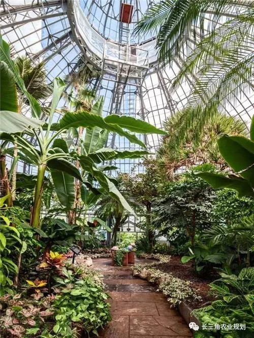 大型展覽溫室的旅游吸引力與觀賞價值主要體現(xiàn)在各種專類植物景觀、特殊觀賞品種上,同時,作為花園中的綠色建筑,溫室本身也通過新的技術手段詮釋了人類與自然、動植物和棲息地間的動態(tài)關系,生動展現(xiàn)園林藝術的動感美。