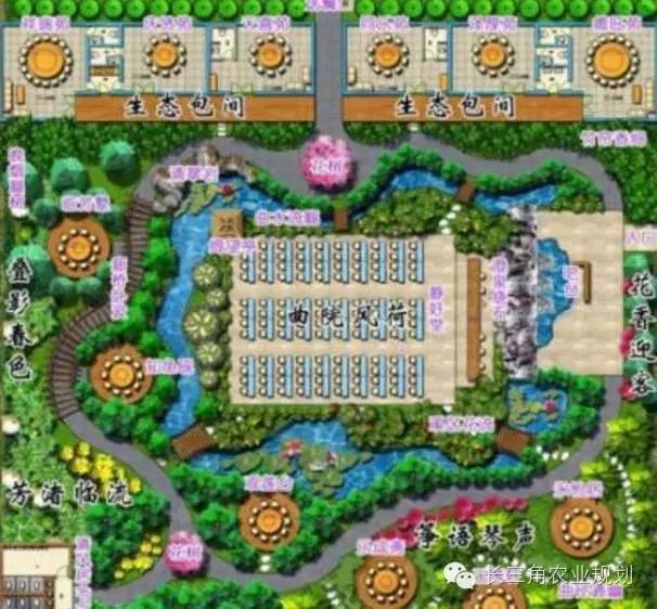 生態(tài)餐廳的園林布景發(fā)揮空間大,可隨意設(shè)計(jì),需要結(jié)合生態(tài)餐廳的餐飲功能進(jìn)行功能分區(qū)。一般而言,生態(tài)餐廳有迎賓接待區(qū)(入口大廳)、觀賞區(qū)、點(diǎn)菜區(qū)、就餐區(qū)、后廚區(qū)、收銀區(qū)、有的還要根據(jù)當(dāng)?shù)仫L(fēng)俗民情設(shè)置宴會(huì)大廳及舞臺(tái)表演區(qū)的功能區(qū)。