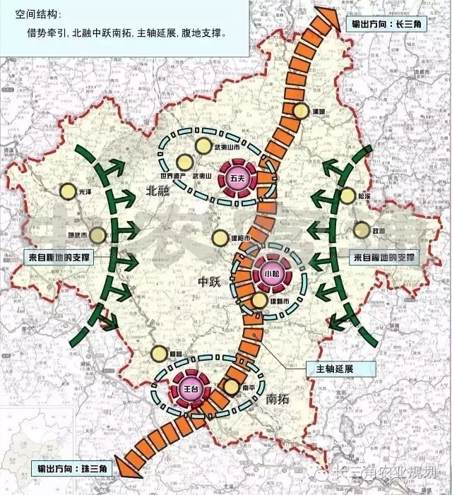 從示范區(qū)三個(gè)綜合園的交通區(qū)位狀況、戰(zhàn)略區(qū)位條件、城鎮(zhèn)發(fā)展基礎(chǔ)、農(nóng)業(yè)資源開發(fā),鏈接海西經(jīng)濟(jì)區(qū)發(fā)展綱要、福建省農(nóng)業(yè)發(fā)展規(guī)劃、南平市城市總體規(guī)劃、土地利用總體規(guī)劃等上位規(guī)劃,形成“借勢(shì)牽引、北融中躍南拓、主軸延展、腹地支撐”的空間結(jié)構(gòu)形態(tài),統(tǒng)籌海峽兩岸(南平)現(xiàn)代農(nóng)業(yè)合作示范區(qū)空間體系發(fā)展。