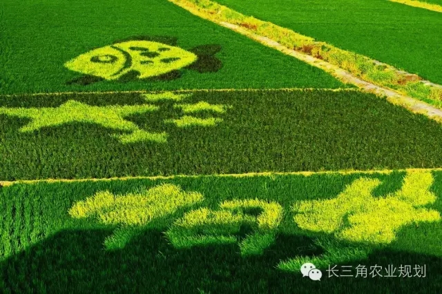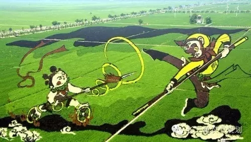 稻田畫又名稻田彩繪,是日本農(nóng)民創(chuàng)作的一種藝術(shù)形式,主要是在水田中種植綠色和紫色葉水稻,栽種時先在農(nóng)田里用傳統(tǒng)畫線器畫出九宮格,依圖樣定出坐標,再牽線描出圖樣或字體輪廓,最后種上彩色秧苗,隨著水稻生長,就會呈現(xiàn)出預先規(guī)劃的圖形或文字。