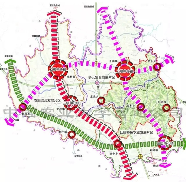 而中農(nóng)富通規(guī)劃設(shè)計(jì)的另一個(gè)項(xiàng)目“四川省綿陽(yáng)市農(nóng)村綜合改革試驗(yàn)區(qū)”則是“一村一體”模式的農(nóng)業(yè)綜合體,其規(guī)劃定位為:產(chǎn)村一體互動(dòng)相融、丘區(qū)地域風(fēng)貌獨(dú)特的四川省丘區(qū)重點(diǎn)扶貧開發(fā)樣板區(qū)、四川省農(nóng)村綜合改革試驗(yàn)先行區(qū)、四川省丘區(qū)生態(tài)綠色農(nóng)業(yè)和幸福美麗新村示范點(diǎn)。采用“重點(diǎn)鄉(xiāng)鎮(zhèn)+示范園區(qū)“、”中心村+生產(chǎn)基地” 發(fā)展模式,近期優(yōu)先扶植培育多個(gè)現(xiàn)代農(nóng)業(yè)示范園,以園區(qū)引領(lǐng),村與規(guī)模產(chǎn)業(yè)組團(tuán)式發(fā)展,指狀伸展,實(shí)現(xiàn)產(chǎn)村一體的發(fā)展思路,快速推動(dòng)產(chǎn)業(yè)與村莊一體化發(fā)展格局。根據(jù)空間關(guān)系、產(chǎn)業(yè)規(guī)模、交通條件等因素整個(gè)核心區(qū)劃分7個(gè)產(chǎn)村單元。每個(gè)產(chǎn)村單元打造一種特色主導(dǎo)產(chǎn)業(yè),兼顧其他產(chǎn)業(yè)發(fā)展。