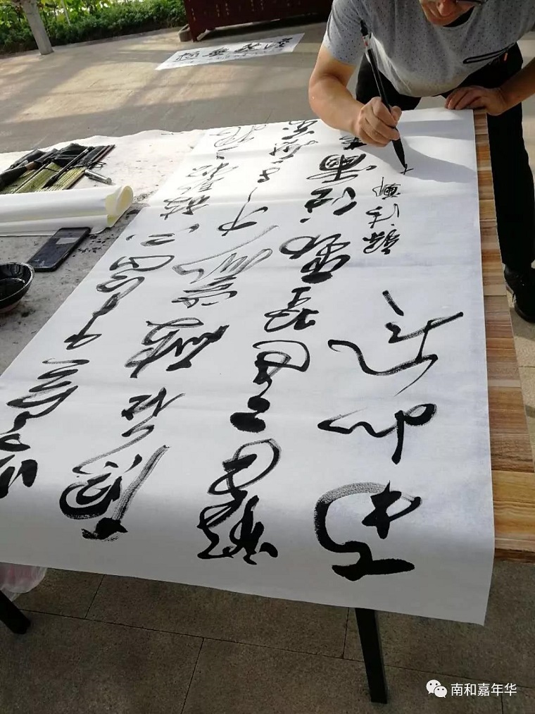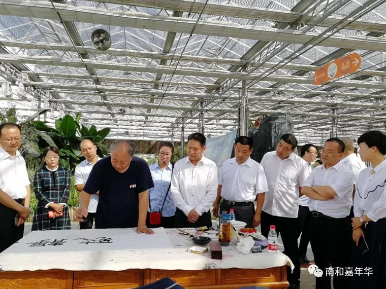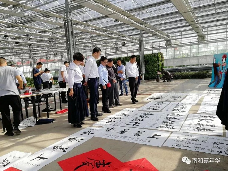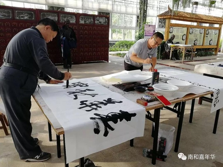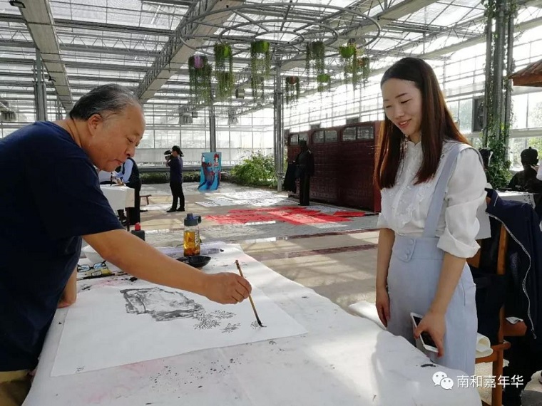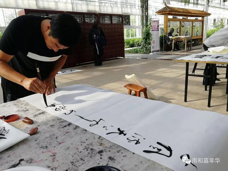 開幕式后,領(lǐng)導(dǎo)一行視察書法筆會。在筆會現(xiàn)場,南和書畫家們揮毫潑墨,爭相獻(xiàn)藝,用飽蘸濃墨的筆觸表達(dá)著對生活的熱愛和對佳節(jié)的祝福。一幅幅精美作品贏得觀眾的嘖嘖稱贊。前來參觀的書畫愛好者們也相互交流,場面氣氛十分熱烈。