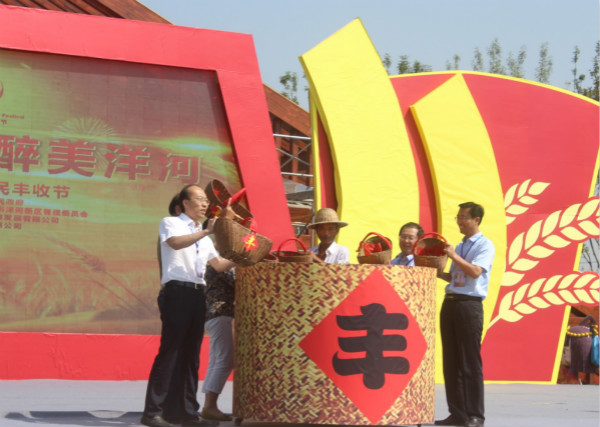 來自洋河當(dāng)?shù)氐膬晌晦r(nóng)民代表王慶豐和劉紅俠,站在舞臺(tái)中央,和洋河新區(qū)黨委書記張聯(lián)東、中國農(nóng)業(yè)大學(xué)農(nóng)業(yè)規(guī)劃科學(xué)研究所所長(zhǎng)張?zhí)熘淌冢约爸袊r(nóng)業(yè)大學(xué)國際學(xué)院原院長(zhǎng)孟繁錫等專家、領(lǐng)導(dǎo)、嘉賓一道,共同將篩里的糧食倒?jié)M糧倉,現(xiàn)場(chǎng)的觀眾發(fā)出“豐收大吉”的歡呼聲響徹全場(chǎng)。