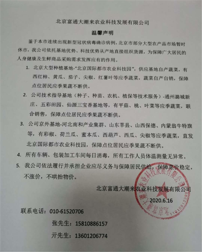 ▼在北京農(nóng)產(chǎn)品市突發(fā)疫情后,北京富通大潮來農(nóng)業(yè)科技發(fā)展有限公司(簡稱 富通大潮來)依托基地優(yōu)勢、科技優(yōu)勢從產(chǎn)地直接組織貨源,為保障廣大居民的人身健康及生鮮商品采購需求發(fā)揮應有的作用。應對非常時期民生需求,全力以赴穩(wěn)價格、保供應。富通大潮來從基地點對點對接 70 余個社區(qū),疫情期間,減少污染接觸環(huán)節(jié),保證市民菜價。
