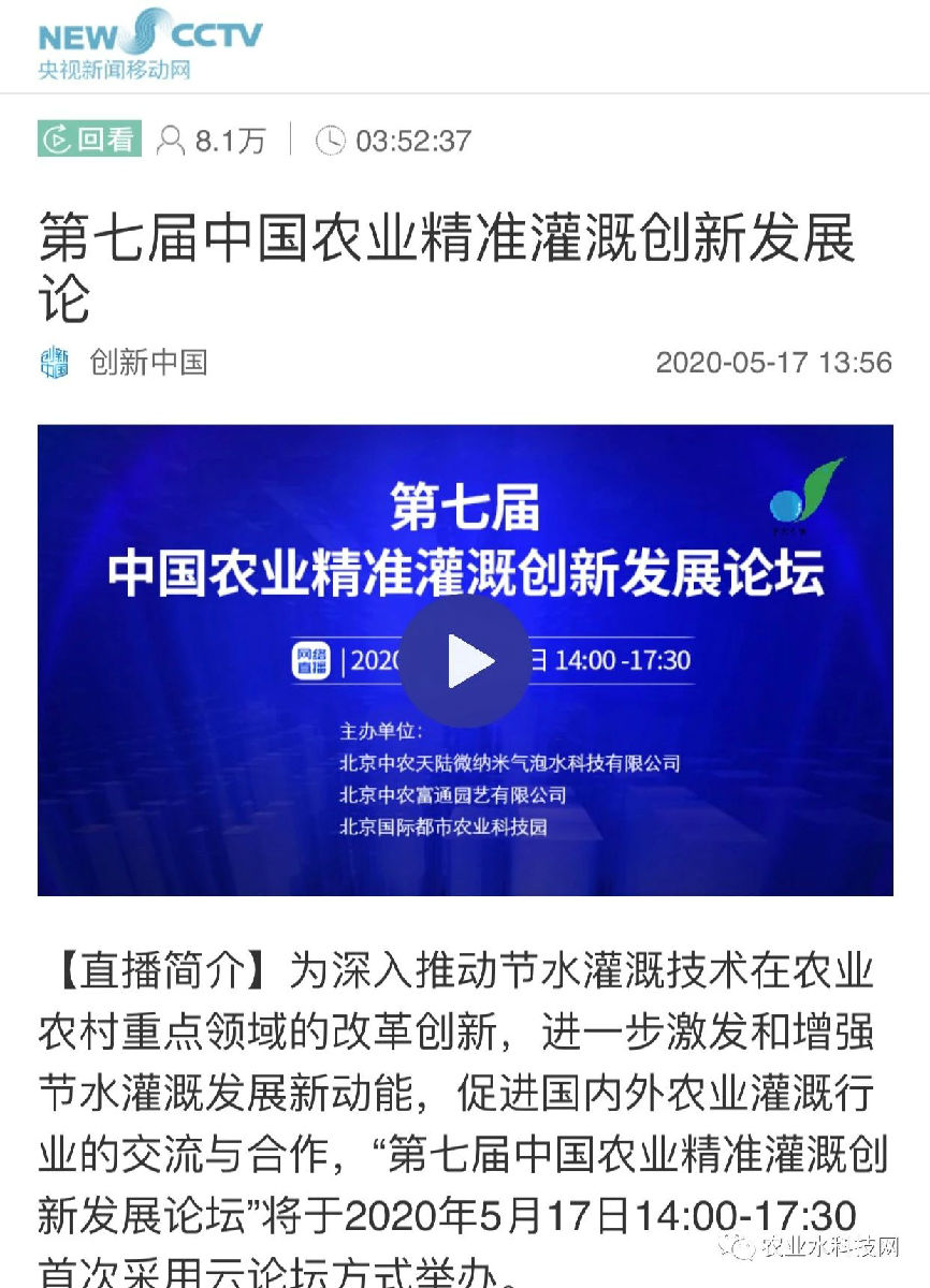 ?2020年5月17日下午,由北京中農(nóng)富通園藝有限公司、北京中農(nóng)天陸微納米氣泡水科技有限公司(簡(jiǎn)稱“中農(nóng)天陸”)、北京國際都市農(nóng)業(yè)科技園共同主辦的“第七屆中國農(nóng)業(yè)精準(zhǔn)灌溉創(chuàng)新發(fā)展論壇”線上論壇順利召開。