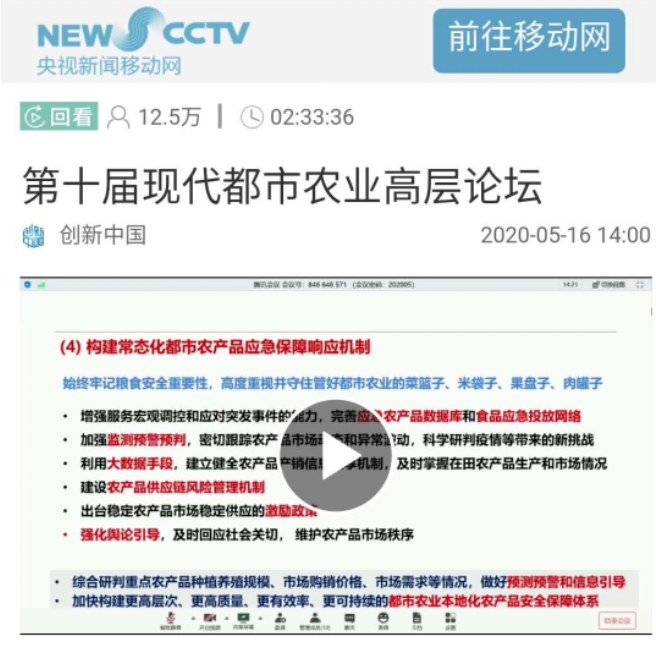 ▼5月16日下午,由中國農(nóng)業(yè)大學(xué)農(nóng)業(yè)規(guī)劃科學(xué)研究所主辦,北京中農(nóng)富通園藝有限公司承辦的第十屆現(xiàn)代都市農(nóng)業(yè)高層論壇取得圓滿成功。此次高層論壇首次采取線上直播的方式。據(jù)16日17點數(shù)據(jù),共13萬余人次在線觀看了本次論壇。