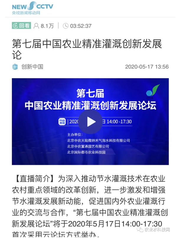 ▼2020年5月17日下午,第十屆北京(通州)國際都市農(nóng)業(yè)科技節(jié)同期舉辦了“第七屆中國農(nóng)業(yè)精準灌溉創(chuàng)新發(fā)展論壇”線上論壇,本次論壇由北京中農(nóng)天陸微納米氣泡水科技有限公司、北京中農(nóng)富通園藝有限公司、北京國際都市農(nóng)業(yè)科技園共同主辦,論壇邀請了農(nóng)業(yè)農(nóng)村部全國農(nóng)業(yè)技術(shù)推廣服務(wù)中心高祥照研究員、中國農(nóng)業(yè)大學(xué)水利與土木工程學(xué)院李光永教授、中國農(nóng)業(yè)科學(xué)院農(nóng)田灌溉研究所馮俊杰研究員、北京中農(nóng)天陸微納米氣泡水科技有限公司項目管理事業(yè)部經(jīng)理許慶廣、以色列耐特菲姆公司中國區(qū)技術(shù)總監(jiān)謝永華、張家口三生智慧農(nóng)業(yè)科技有限公司副總經(jīng)理王衛(wèi)忠、科迪馬集團中國區(qū)銷售經(jīng)理李大征等嘉賓進行了精彩的交流分享,取得圓滿成功。