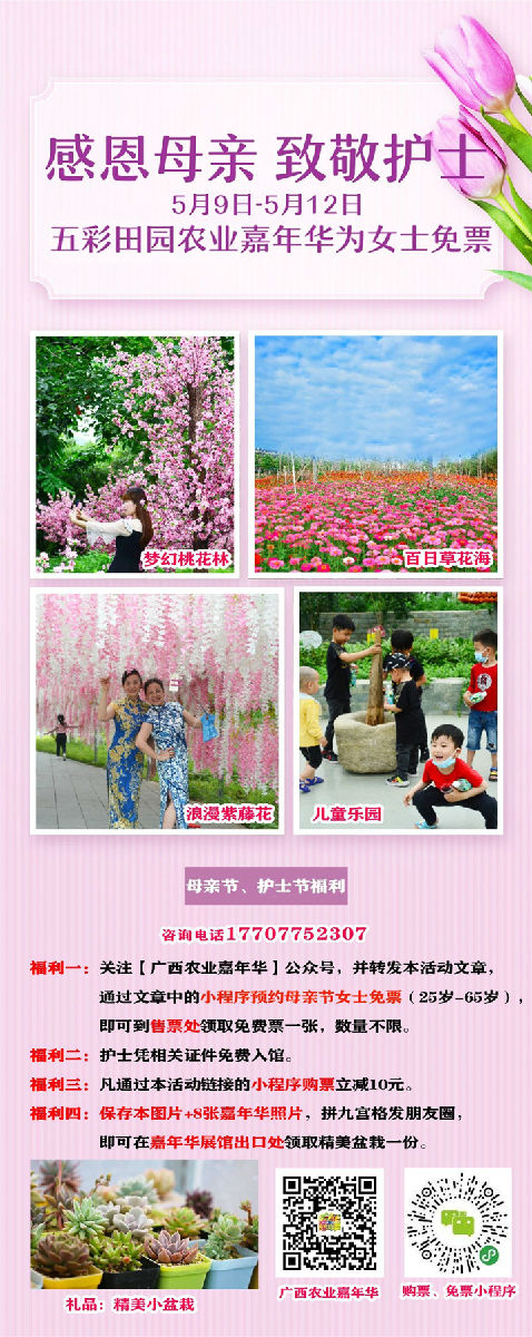 ▼濃情五月將迎來了母親節(jié)(5月10日)和國際護士節(jié)(5月12日),廣西玉林“五彩田園”農(nóng)業(yè)嘉年華給世界上最可愛的兩個人送上最誠摯的祝福和最大的福利。一起看農(nóng)藝高科、游浪漫花海、享農(nóng)耕體驗、品田園名果。詳情請戳?感恩母親,致敬護士!傳遞愛心,五彩田園農(nóng)業(yè)嘉年華為女士免票!女士免票!