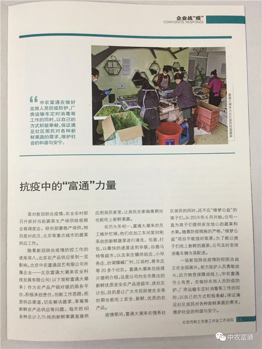 ▼《北京市院士專家工作站工作動(dòng)態(tài)》抗疫專刊 — 抗疫中的“富通”力量。文中記載了中農(nóng)富通在做好在崗人員防疫防護(hù)、廠房運(yùn)輸車定時(shí)消毒等工作的同時(shí),以自己的方式積極奉獻(xiàn),保證滿足社區(qū)居民對(duì)各種新鮮果蔬的需求,維護(hù)社會(huì)的和諧與安寧。