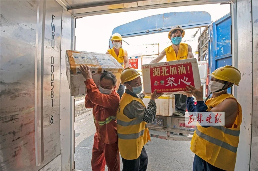 ▼3月9日上午,兩輛裝滿支援湖北果蔬的貨車從五彩田園中農(nóng)富玉基地發(fā)車,駛向玉林火車站“廣西(玉林市)支援湖北果蔬物資冷鏈專列”。車上載滿了廣西中農(nóng)富玉國際農(nóng)業(yè)科技有限公司(以下簡稱中農(nóng)富玉)及中農(nóng)富玉聯(lián)合本地的愛心企業(yè)、合作社捐贈(zèng)的優(yōu)質(zhì)農(nóng)產(chǎn)品。