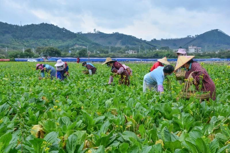 ▼在海峽兩岸(廣西玉林)農業(yè)合作科技示范園(中農富玉農場)的蔬菜基地里,廣西中農富玉國際農業(yè)科技有限公司(簡稱中農富玉)公司員工和農戶,一起采摘新鮮蔬菜、稱重裝箱、裝車……這些新鮮蔬菜幾天后將送到湖北人民的餐桌。