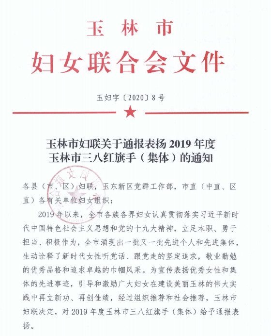 ▼為宣傳表揚優(yōu)秀女性和集體的先進事跡,引導和激勵廣大婦女在建設美麗玉林的偉大實踐中再立新功、再創(chuàng)佳績,經過組織推薦和社會推薦,玉林市婦聯(lián)決定對2019年度玉林市三八紅旗手(集體)給予通報表揚。經各方推薦、嚴格評選。廣西中農富玉國際農業(yè)科技有限公司(以下稱中農富玉)被授予“2019年度玉林市三八紅旗集體”榮譽稱號。