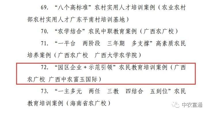 ▼廣西中農富玉國際農業(yè)科技有限公司榮獲“100個全國農民教育培訓發(fā)展典型案例”、“100個全國示范農民田間學?!睒s譽稱號。