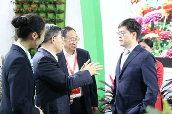 湖南省委副書記烏蘭、益陽市委書記瞿海、赫山區(qū)委書記鄧正安來到益陽現(xiàn)代農(nóng)業(yè)嘉年華展區(qū),各位領(lǐng)導在展示的特色蔬菜、花卉前聽取講解員的詳細介紹