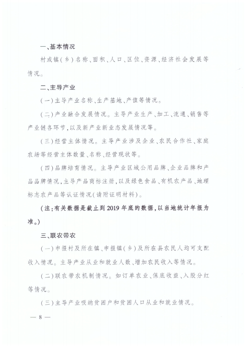 近年來,各地緊扣鄉(xiāng)村產(chǎn)業(yè)振興目標,以村或鎮(zhèn)(鄉(xiāng))為區(qū)域,培育了一批地域特色鮮明、鄉(xiāng)土氣息濃厚、業(yè)態(tài)類型豐富、創(chuàng)新創(chuàng)業(yè)活躍、綜合實力強的“一村一品”村鎮(zhèn),引領鄉(xiāng)村產(chǎn)業(yè)發(fā)展。為貫徹落實中央1號文件和《國務院關于促進鄉(xiāng)村產(chǎn)業(yè)振興的指導意見》精神,加快發(fā)展壯大鄉(xiāng)村產(chǎn)業(yè),我部決定開展第十批全國 “一村一品”示范村鎮(zhèn)認定工作,現(xiàn)將有關事項通知如下: