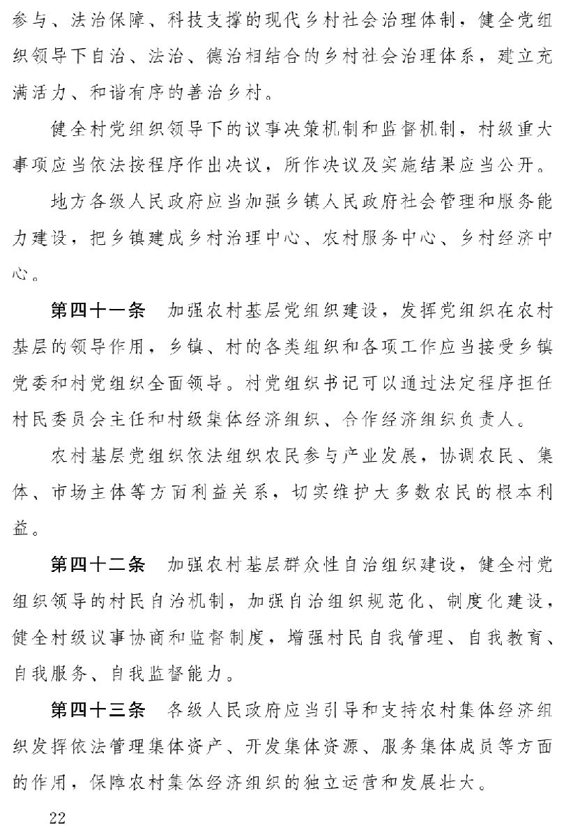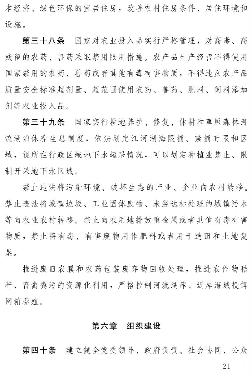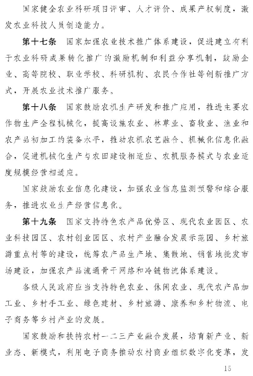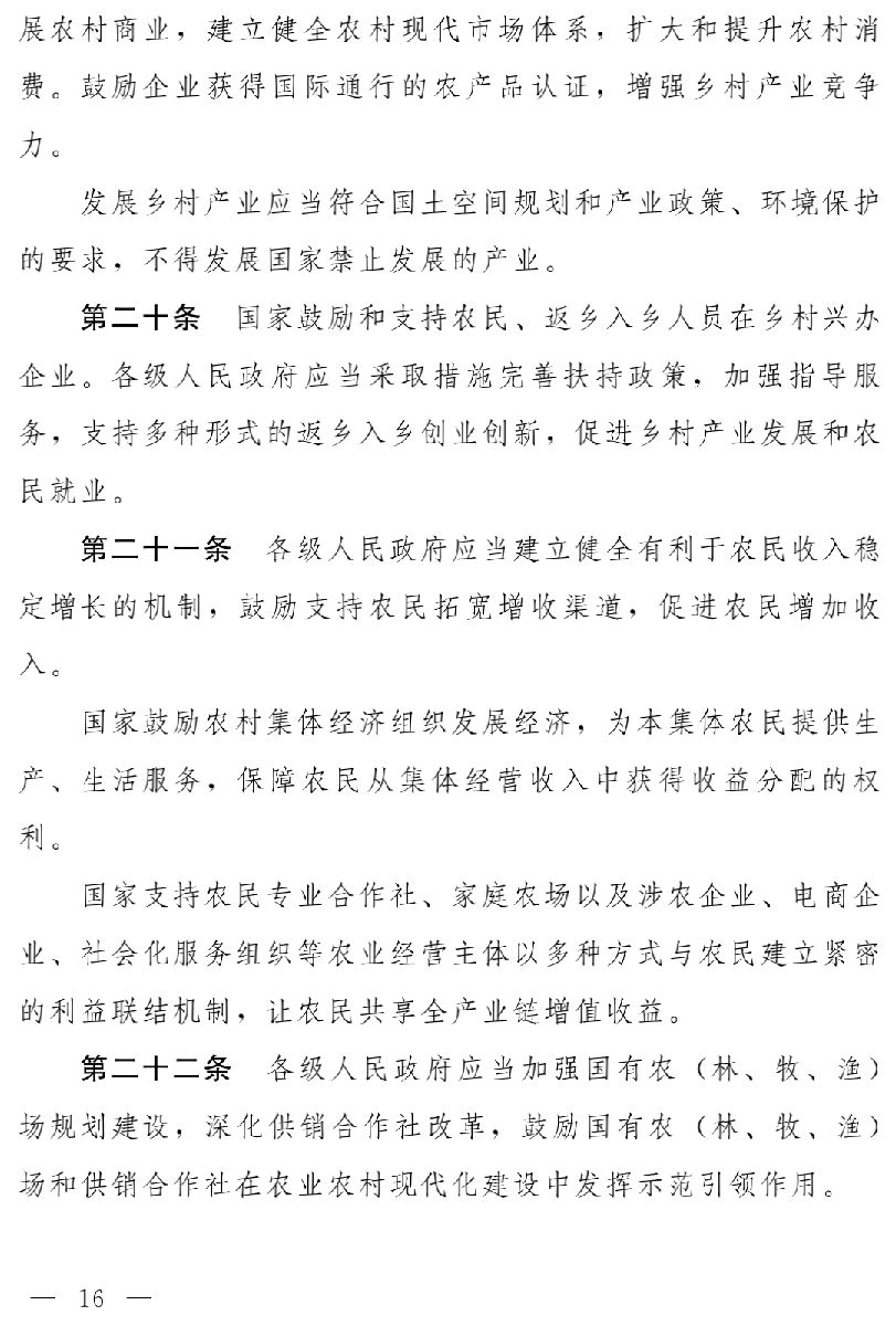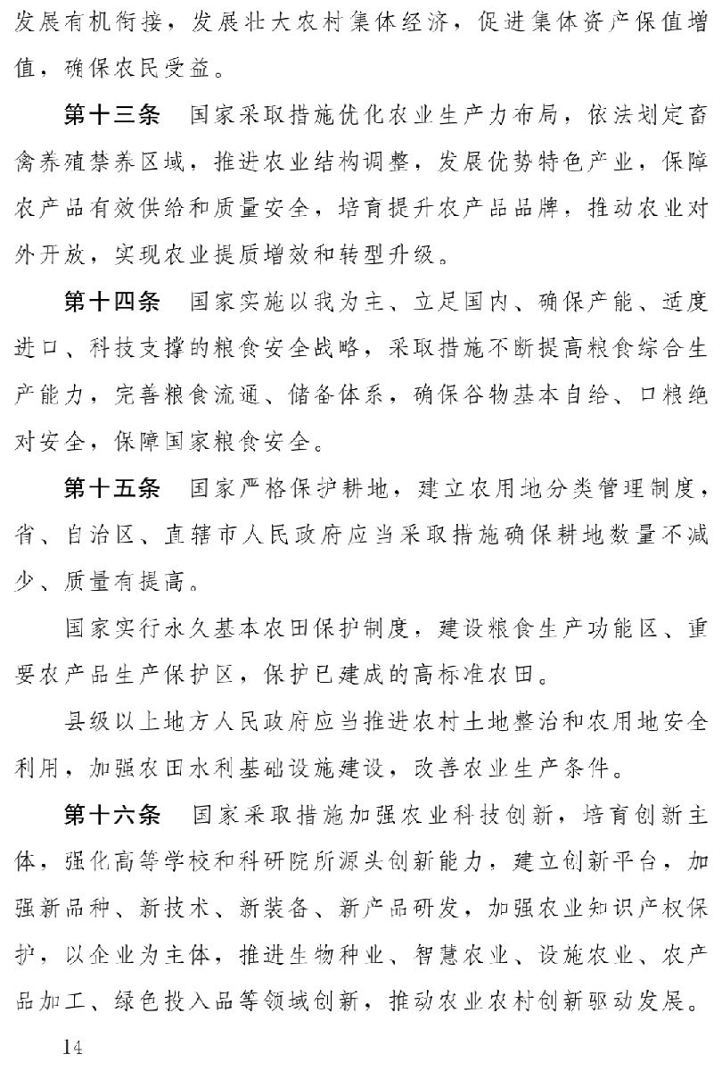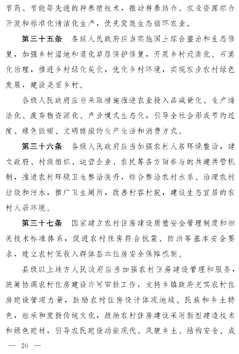 因此,草案第二章至第六章分別以五大振興為主要內(nèi)容,著重從產(chǎn)業(yè)發(fā)展、人才支撐、文化傳承、生態(tài)保護(hù)、組織建設(shè)等方面,將黨中央有關(guān)方針政策和地方實踐中的成功經(jīng)驗,通過立法形式確定下來,明確相關(guān)政策措施,完善相關(guān)制度,保障鄉(xiāng)村全面振興。特別是著重圍繞發(fā)展壯大農(nóng)村集體經(jīng)濟(jì)、培育新型農(nóng)業(yè)經(jīng)營主體、促進(jìn)農(nóng)業(yè)轉(zhuǎn)型升級、不斷提高農(nóng)業(yè)科技水平、嚴(yán)格保護(hù)耕地、保障糧食等主要農(nóng)產(chǎn)品供給、改善鄉(xiāng)村生態(tài)和人居環(huán)境、提高鄉(xiāng)村文明程度和思想道德建設(shè)水平、傳承和發(fā)展中華優(yōu)秀傳統(tǒng)文化、建立健全鄉(xiāng)村社會治理體系、加強(qiáng)基層組織建設(shè)等方面,作出相應(yīng)規(guī)定。