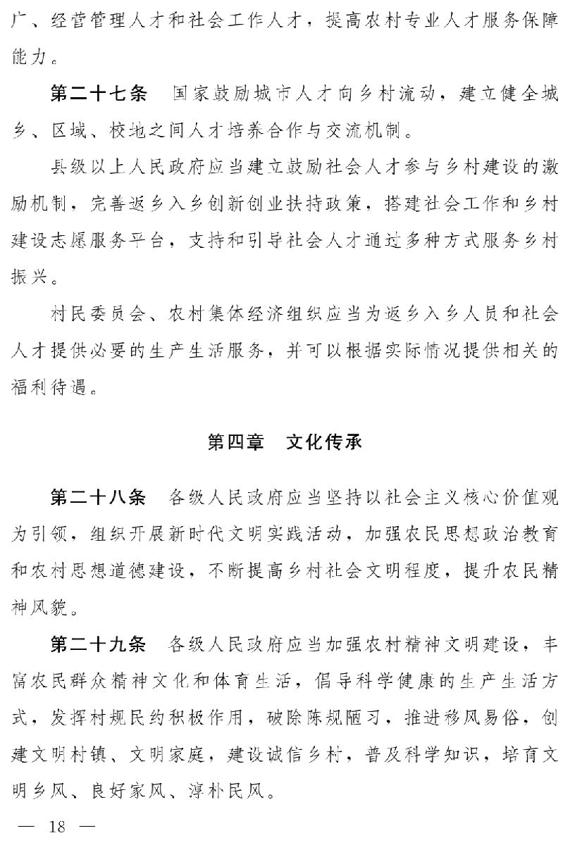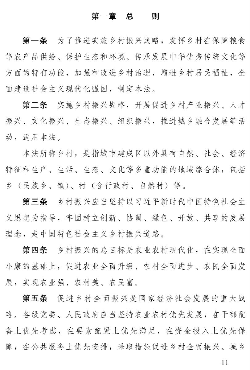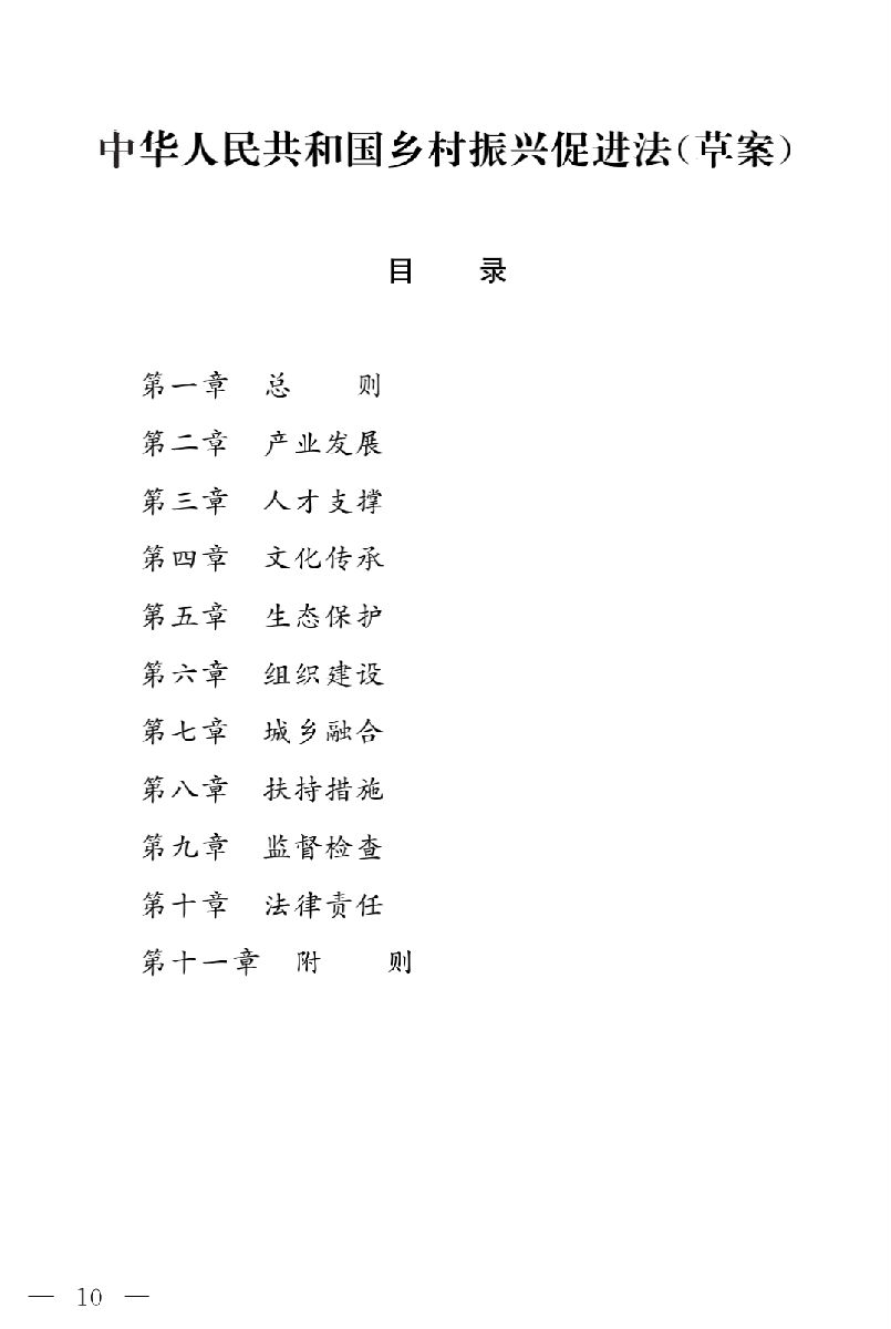 草案分為十一章,依次為總則、產(chǎn)業(yè)發(fā)展、人才支撐、文化傳承、生態(tài)保護(hù)、組織建設(shè)、城鄉(xiāng)融合、扶持措施、監(jiān)督檢查、法律責(zé)任、附則,共七十六條。