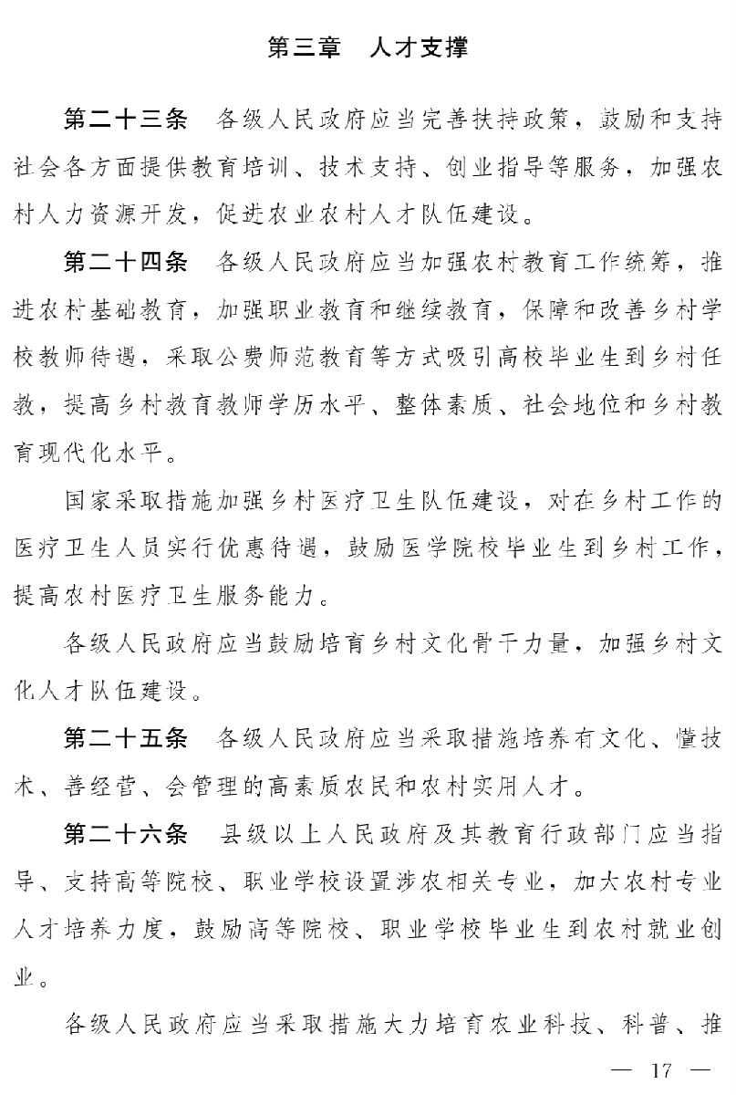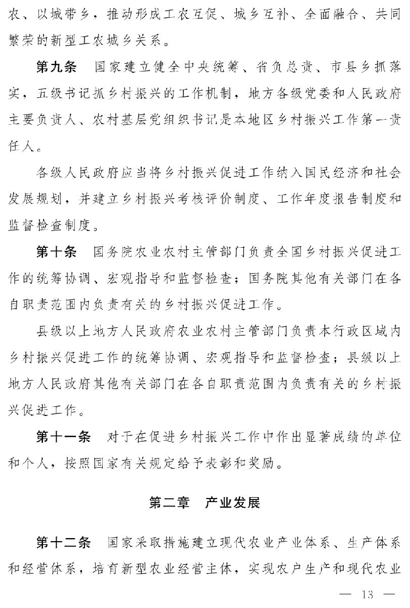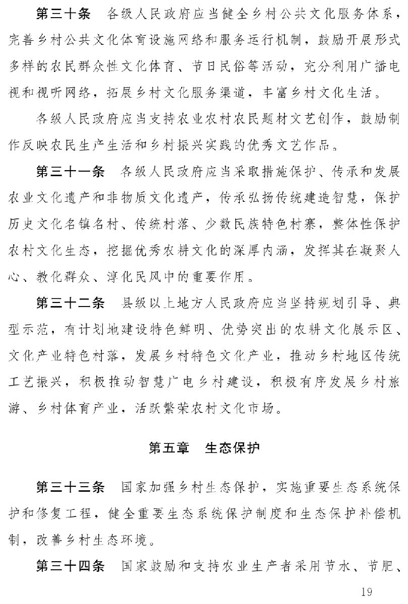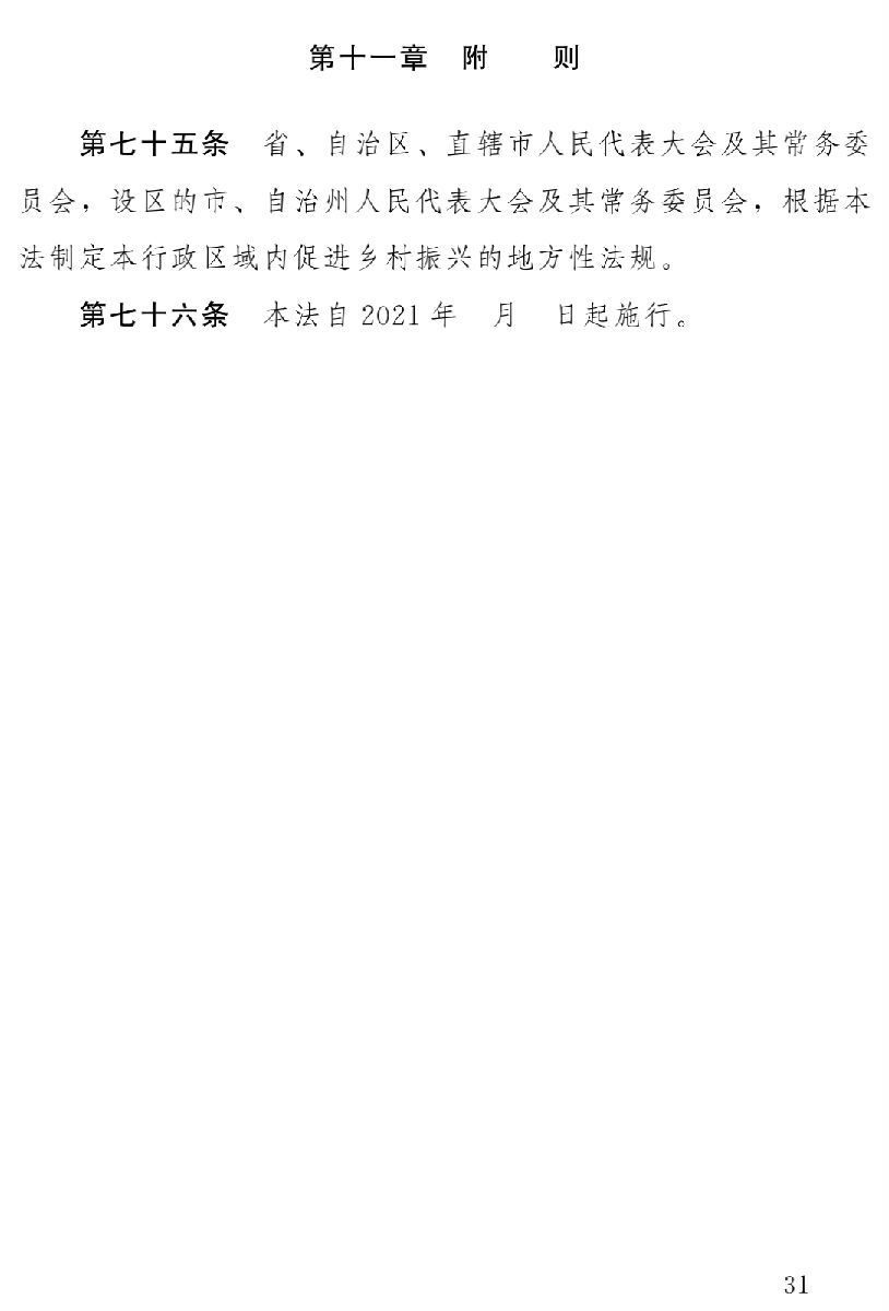草案分為十一章,依次為總則、產(chǎn)業(yè)發(fā)展、人才支撐、文化傳承、生態(tài)保護(hù)、組織建設(shè)、城鄉(xiāng)融合、扶持措施、監(jiān)督檢查、法律責(zé)任、附則,共七十六條。