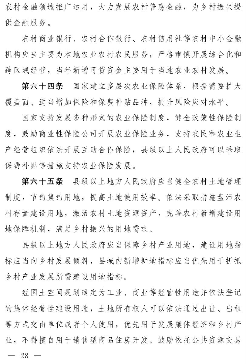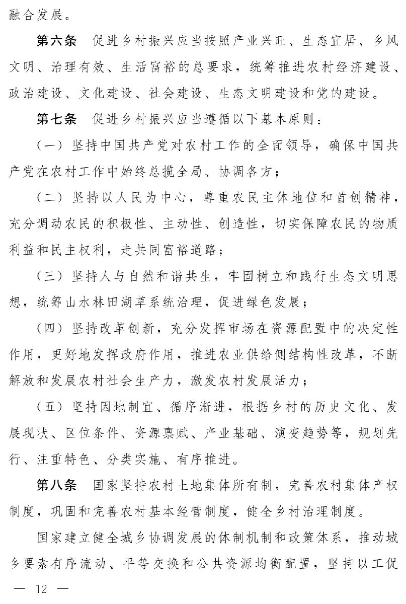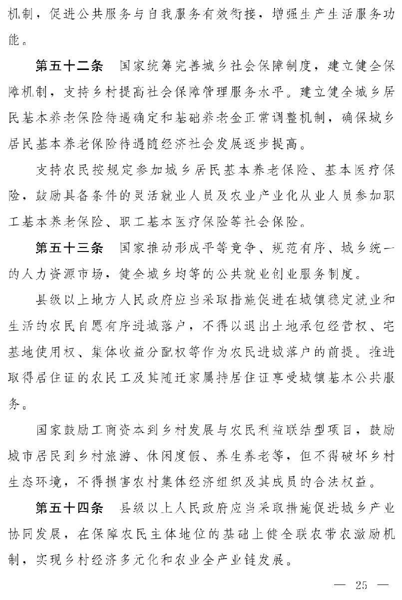 實施鄉(xiāng)村振興戰(zhàn)略,必須重塑城鄉(xiāng)關(guān)系,走城鄉(xiāng)融合發(fā)展之路。要堅持好農(nóng)村基本制度,堅守好底線,保護(hù)好農(nóng)民利益,更好激發(fā)農(nóng)村內(nèi)部發(fā)展活力;同時,要著力統(tǒng)籌城鄉(xiāng)基礎(chǔ)設(shè)施建設(shè),促進(jìn)城鄉(xiāng)基本公共服務(wù)均等化,優(yōu)化農(nóng)村外部發(fā)展環(huán)境,縮小城鄉(xiāng)發(fā)展差距。對此,草案規(guī)定:國家堅持農(nóng)村土地集體所有制,完善農(nóng)村集體產(chǎn)權(quán)制度,鞏固和完善農(nóng)村基本經(jīng)營制度,健全鄉(xiāng)村治理制度;建立健全城鄉(xiāng)融合發(fā)展的體制機(jī)制和政策體系,推動形成工農(nóng)互促、城鄉(xiāng)互補(bǔ)、全面融合、共同繁榮的新型工農(nóng)城鄉(xiāng)關(guān)系(第八條)。還專設(shè)一章,規(guī)定各級人民政府應(yīng)當(dāng)協(xié)同推進(jìn)鄉(xiāng)村振興戰(zhàn)略和新型城鎮(zhèn)化戰(zhàn)略,促進(jìn)農(nóng)村一二三產(chǎn)業(yè)融合發(fā)展和城鄉(xiāng)一體化發(fā)展;縣級以上人民政府應(yīng)當(dāng)推進(jìn)城鄉(xiāng)統(tǒng)一規(guī)劃,因地制宜安排村莊布局,完善城鄉(xiāng)基本公共服務(wù)體系,提高鄉(xiāng)村居民社會保障水平,推動人口、土地、資本等要素在城鄉(xiāng)間有序流動,采取措施促進(jìn)城鄉(xiāng)產(chǎn)業(yè)協(xié)同發(fā)展,實現(xiàn)鄉(xiāng)村經(jīng)濟(jì)多元化和農(nóng)業(yè)全產(chǎn)業(yè)鏈發(fā)展,建立健全有利于農(nóng)民收入持續(xù)穩(wěn)定增長的機(jī)制(第七章)。