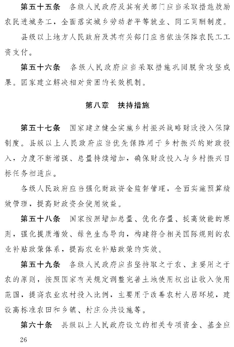 實施鄉(xiāng)村振興戰(zhàn)略,堅持農(nóng)業(yè)農(nóng)村優(yōu)先發(fā)展,必須強(qiáng)化鄉(xiāng)村振興的扶持措施。黨的十八大以來,黨中央持續(xù)加大強(qiáng)農(nóng)惠農(nóng)富農(nóng)政策力度,出臺了一系列切實有效的政策措施,有力促進(jìn)了農(nóng)業(yè)農(nóng)村發(fā)展。2018年中央一號文件明確提出,實施鄉(xiāng)村振興戰(zhàn)略,必須解決錢從哪里來的問題,要健全投入保障制度,確保財政投入持續(xù)增長,拓寬資金籌集渠道,創(chuàng)新投融資機(jī)制,提高金融服務(wù)水平,加快形成財政優(yōu)先保障、金融重點傾斜、社會積極參與的多元投入格局,確保投入力度不斷增強(qiáng)、總量持續(xù)增加。為此,草案專設(shè)扶持措施一章,將黨中央強(qiáng)農(nóng)惠農(nóng)富農(nóng)政策上升為法律規(guī)范,分別就財政投入、農(nóng)業(yè)補(bǔ)貼、土地出讓收入、資金基金、融資擔(dān)保、資本市場、金融服務(wù)、農(nóng)業(yè)保險、用地保障,以及社會資本參與鄉(xiāng)村振興等作出規(guī)定,從政策扶持上落實農(nóng)業(yè)農(nóng)村優(yōu)先發(fā)展。(第八章)