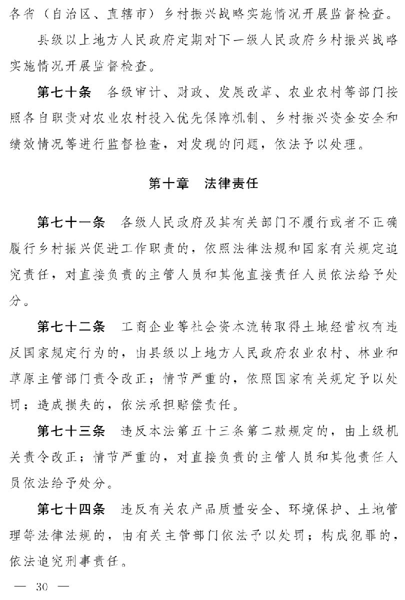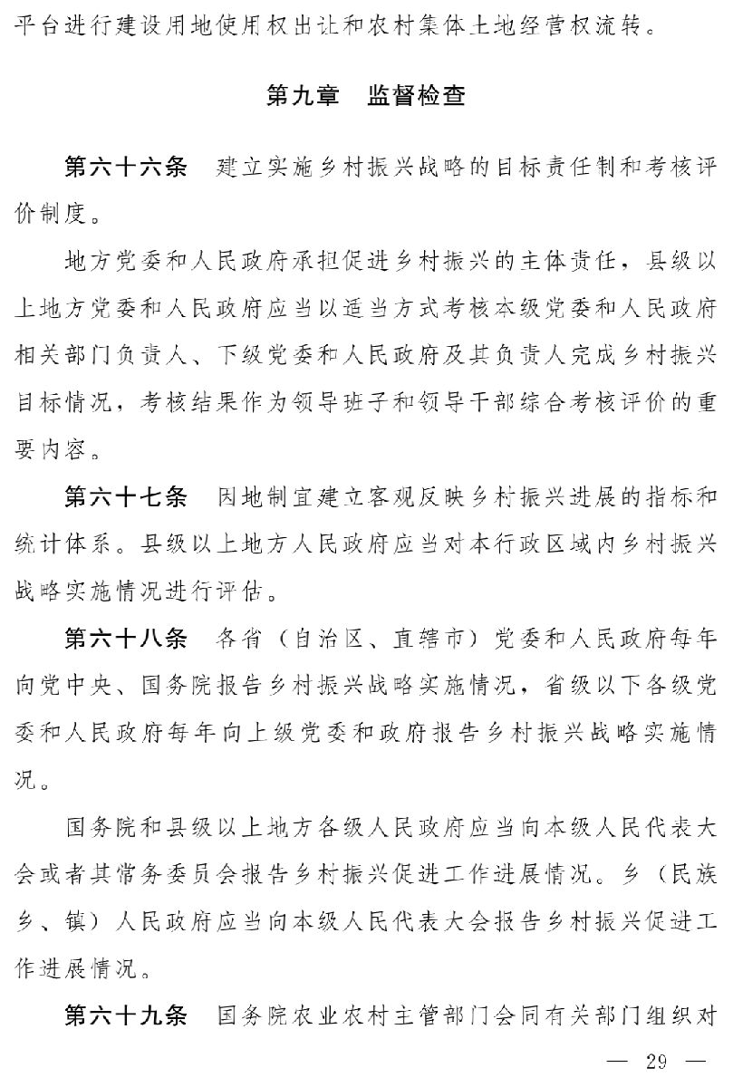 為確保鄉(xiāng)村振興各項工作有效開展,層層壓實推進(jìn)鄉(xiāng)村振興的責(zé)任,草案設(shè)監(jiān)督檢查一章,多層次、多角度地落實鄉(xiāng)村振興相關(guān)方面的責(zé)任。草案明確,建立實施鄉(xiāng)村振興戰(zhàn)略的目標(biāo)責(zé)任制和考核評價制度,地方黨委和人民政府承擔(dān)促進(jìn)鄉(xiāng)村振興的主體責(zé)任,縣級以上地方黨委和人民政府應(yīng)當(dāng)以適當(dāng)方式考核本級黨委和人民政府相關(guān)部門負(fù)責(zé)人、下級黨委和人民政府及其負(fù)責(zé)人完成鄉(xiāng)村振興目標(biāo)情況,考核結(jié)果作為有關(guān)領(lǐng)導(dǎo)班子和領(lǐng)導(dǎo)干部綜合考核評價的重要內(nèi)容(第六十六條)。草案還規(guī)定,各省(自治區(qū)、直轄市)黨委和政府每年向黨中央、國務(wù)院報告鄉(xiāng)村振興戰(zhàn)略實施情況,省級以下各級黨委和政府每年向上級黨委和政府報告鄉(xiāng)村振興戰(zhàn)略實施情況。國務(wù)院和縣級以上地方各級人民政府應(yīng)當(dāng)向本級人民代表大會或者其常務(wù)委員會報告鄉(xiāng)村振興促進(jìn)工作進(jìn)展情況。鄉(xiāng)(民族鄉(xiāng)、鎮(zhèn))人民政府應(yīng)當(dāng)向本級人民代表大會報告鄉(xiāng)村振興促進(jìn)工作進(jìn)展情況(第六十八條)。此外,草案還明確了各級審計、財政、發(fā)展改革、農(nóng)業(yè)農(nóng)村等部門以及縣級以上人民政府的監(jiān)督檢查職責(zé)(第六十九條、第七十條)。