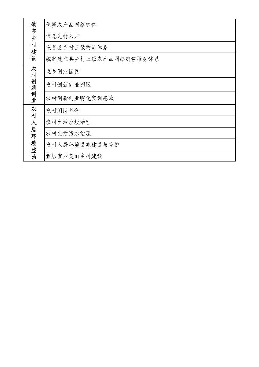 (十一)農(nóng)村創(chuàng)新創(chuàng)業(yè)。鼓勵社會資本投資建設(shè)返鄉(xiāng)創(chuàng)業(yè)園區(qū)、農(nóng)村創(chuàng)新創(chuàng)業(yè)園區(qū)、農(nóng)村創(chuàng)新創(chuàng)業(yè)孵化實訓基地等平臺載體,加強各類創(chuàng)新創(chuàng)業(yè)平臺載體的基礎(chǔ)設(shè)施、服務體系建設(shè),推動產(chǎn)學研用合作,激發(fā)農(nóng)村創(chuàng)新創(chuàng)業(yè)活力。鼓勵社會資本聯(lián)合普通高校、職業(yè)院校、優(yōu)質(zhì)教育培訓機構(gòu)等開展面向農(nóng)村創(chuàng)新創(chuàng)業(yè)人員的創(chuàng)業(yè)能力、產(chǎn)業(yè)技術(shù)、經(jīng)營管理培訓,強化鄉(xiāng)村振興人才支撐。