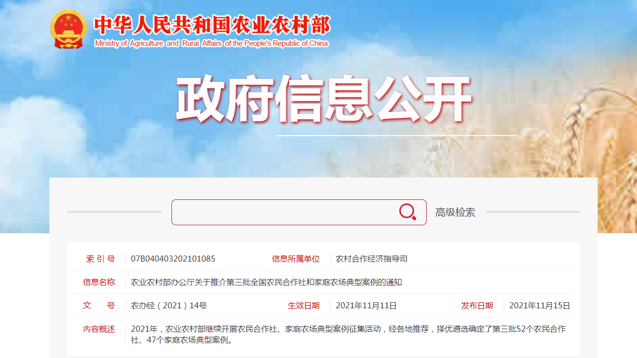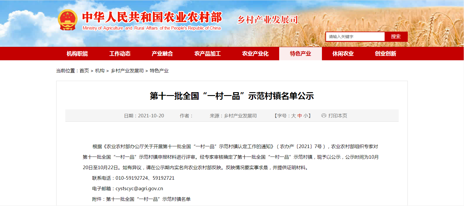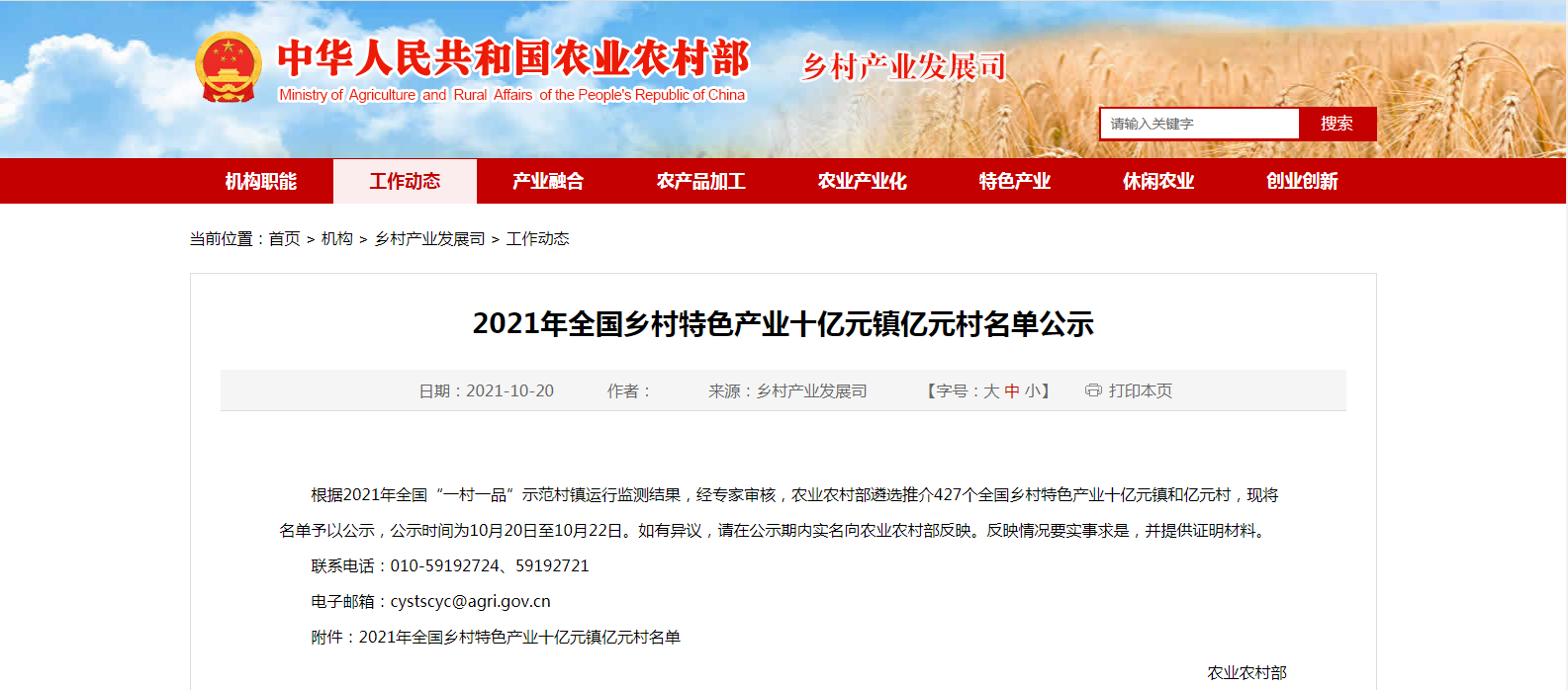 根據(jù)2021年全國(guó)“一村一品”示范村鎮(zhèn)運(yùn)行監(jiān)測(cè)結(jié)果,經(jīng)專家審核,農(nóng)業(yè)農(nóng)村部遴選推介427個(gè)全國(guó)鄉(xiāng)村特色產(chǎn)業(yè)十億元鎮(zhèn)和億元村,現(xiàn)將名單予以公示,公示時(shí)間為10......