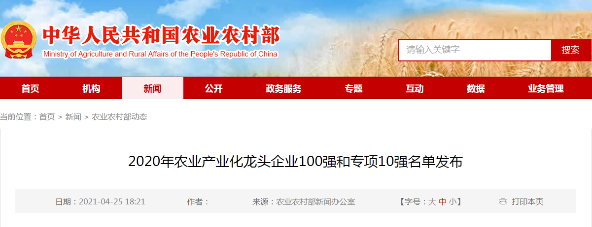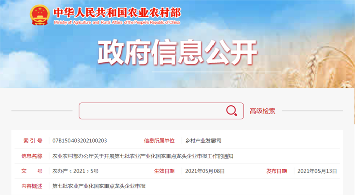 農(nóng)業(yè)農(nóng)村部辦公廳關(guān)于開展第七批農(nóng)業(yè)產(chǎn)業(yè)化國家重點(diǎn)龍頭企業(yè)申報(bào)工作的通知各省、自治區(qū)、直轄市農(nóng)業(yè)農(nóng)村(農(nóng)牧)廳(局、委),新疆生產(chǎn)建設(shè)兵團(tuán)農(nóng)業(yè)農(nóng)村局:為貫徹落實(shí)中......