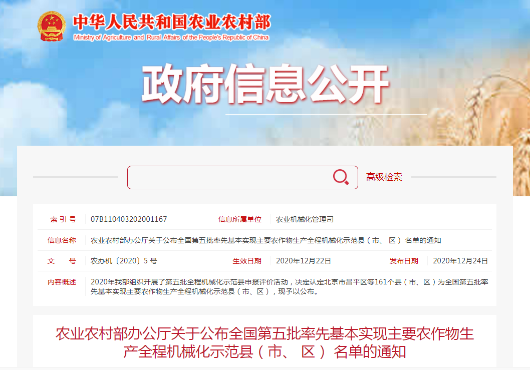 ,2020年我部組織開(kāi)展了第五批全程機(jī)械化示范縣申報(bào)評(píng)價(jià)活動(dòng)。在各地?fù)駜?yōu)申報(bào)、省級(jí)初評(píng)推薦的基礎(chǔ)上,經(jīng)組織現(xiàn)場(chǎng)抽查、專家審核復(fù)評(píng)和網(wǎng)上公示,決定認(rèn)定北京市昌平區(qū)......