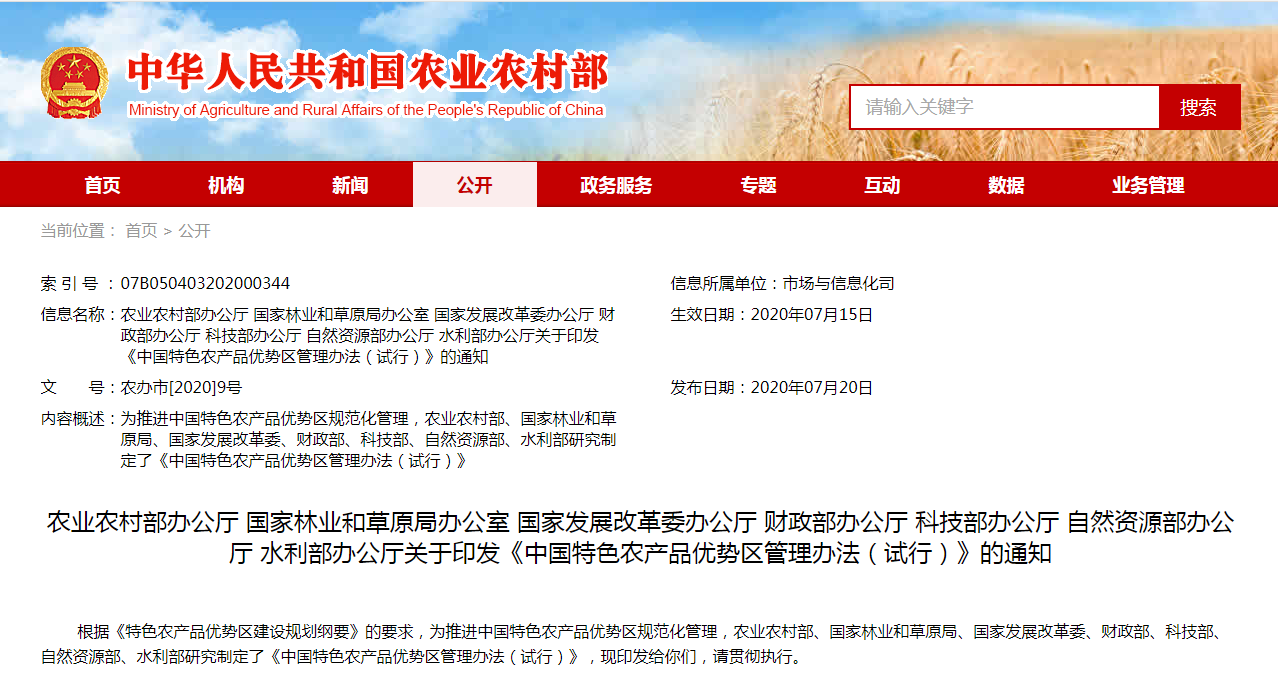 根據(jù)《特色農(nóng)產(chǎn)品優(yōu)勢區(qū)建設(shè)規(guī)劃綱要》的要求,為推進(jìn)中國特色農(nóng)產(chǎn)品優(yōu)勢區(qū)規(guī)范化管理,農(nóng)業(yè)農(nóng)村部、國家林業(yè)和草原局、國家發(fā)展改革委、財政部、科技部、自然資源部、水利......