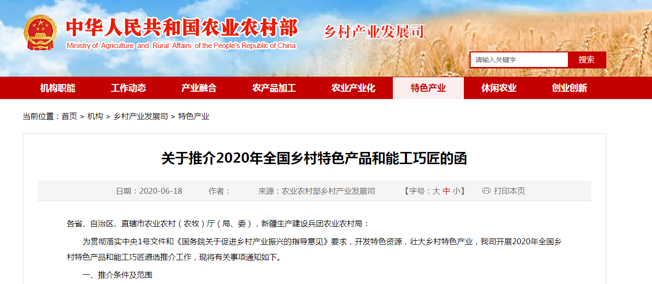 6月18日,農(nóng)業(yè)農(nóng)村部向各地發(fā)出《關(guān)于推介2020年全國鄉(xiāng)村特色產(chǎn)品和能工巧匠的函》。...