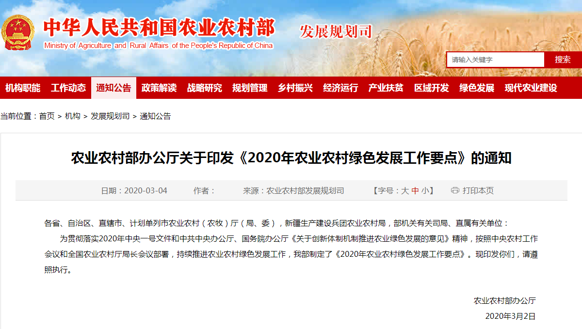 農(nóng)業(yè)農(nóng)村部辦公廳關(guān)于印發(fā)《2020年農(nóng)業(yè)農(nóng)村綠色發(fā)展工作要點(diǎn)》的通知 ...