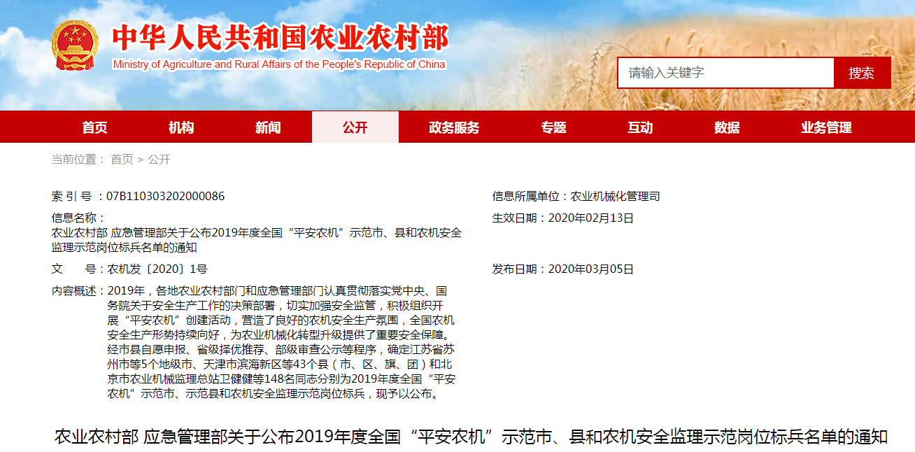 關(guān)于公布2019年度全國“平安農(nóng)機(jī)”示范市、縣和農(nóng)機(jī)安全監(jiān)理示范崗位標(biāo)兵名單的通知...