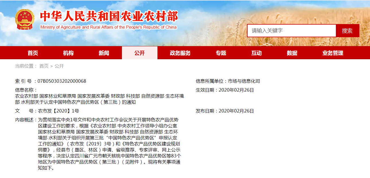 經(jīng)縣市(墾區(qū)、林區(qū))申請、省級推薦、專家評審、網(wǎng)上公示等程序,決定認(rèn)定四川省廣元市朝天核桃中國特色農(nóng)產(chǎn)品優(yōu)勢區(qū)等83個地區(qū)為中國特色農(nóng)產(chǎn)品優(yōu)勢區(qū)(第三批)(見附......