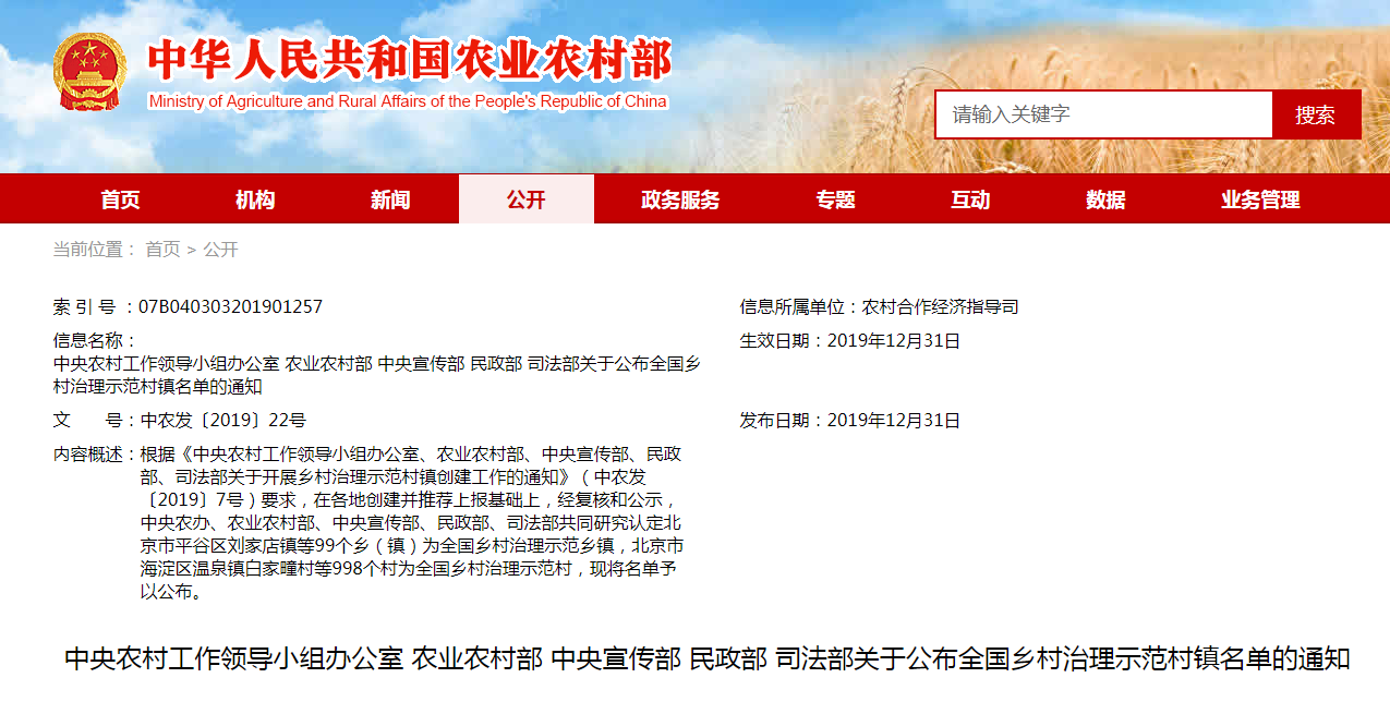 為貫徹落實(shí)中央關(guān)于推進(jìn)鄉(xiāng)村治理體系與治理能力現(xiàn)代化的決策部署,發(fā)揮典型經(jīng)驗(yàn)的示范引領(lǐng)作用,根據(jù)《中央農(nóng)村工作領(lǐng)導(dǎo)小組辦公室、農(nóng)業(yè)農(nóng)村部、中央宣傳部、民政部、司法......