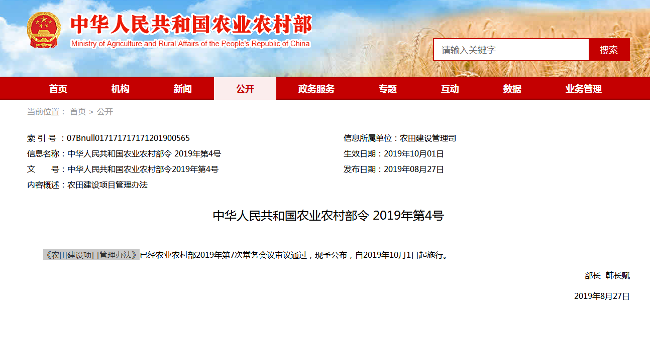《農(nóng)田建設(shè)項(xiàng)目管理辦法》已經(jīng)農(nóng)業(yè)農(nóng)村部2019年第7次常務(wù)會(huì)議審議通過,現(xiàn)予公布,自2019年10月1日起施行。 ...