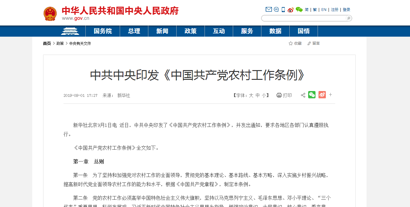 新華社北京9月1日電 近日,中共中央印發(fā)了《中國共產(chǎn)黨農(nóng)村工作條例》,并發(fā)出通知,要求各地區(qū)各部門認(rèn)真遵照?qǐng)?zhí)行。...