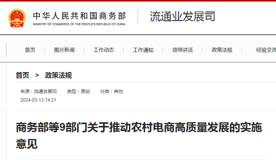 近日,商務部、中央網信辦、財政部、交通運輸部、農業農村部、市場監管總局、國家郵政局、共青團中央、供銷合作總社聯合印發《關于推動農村電商高質量發展的實施意見》。《......